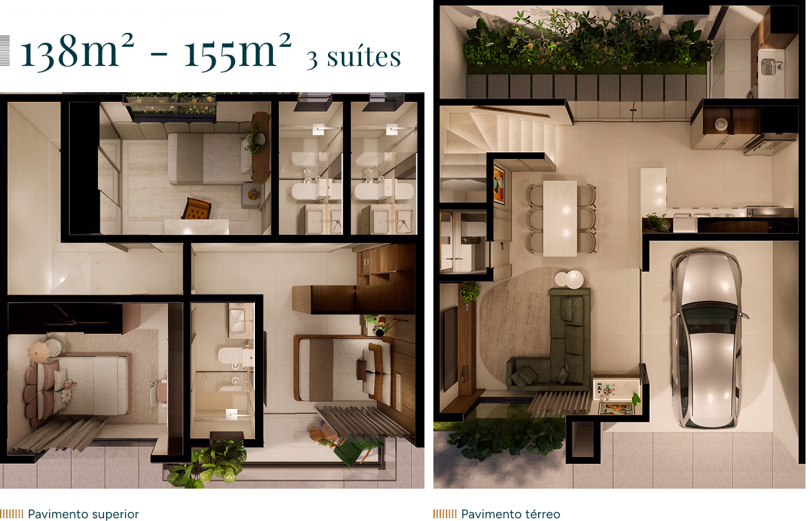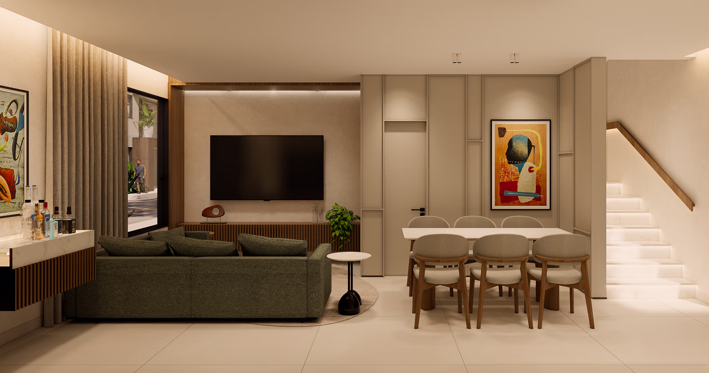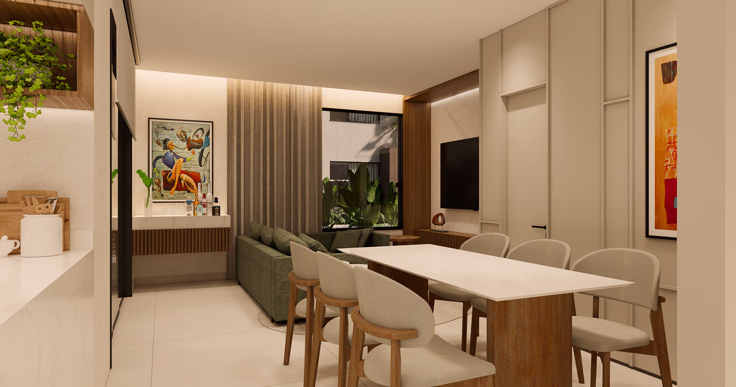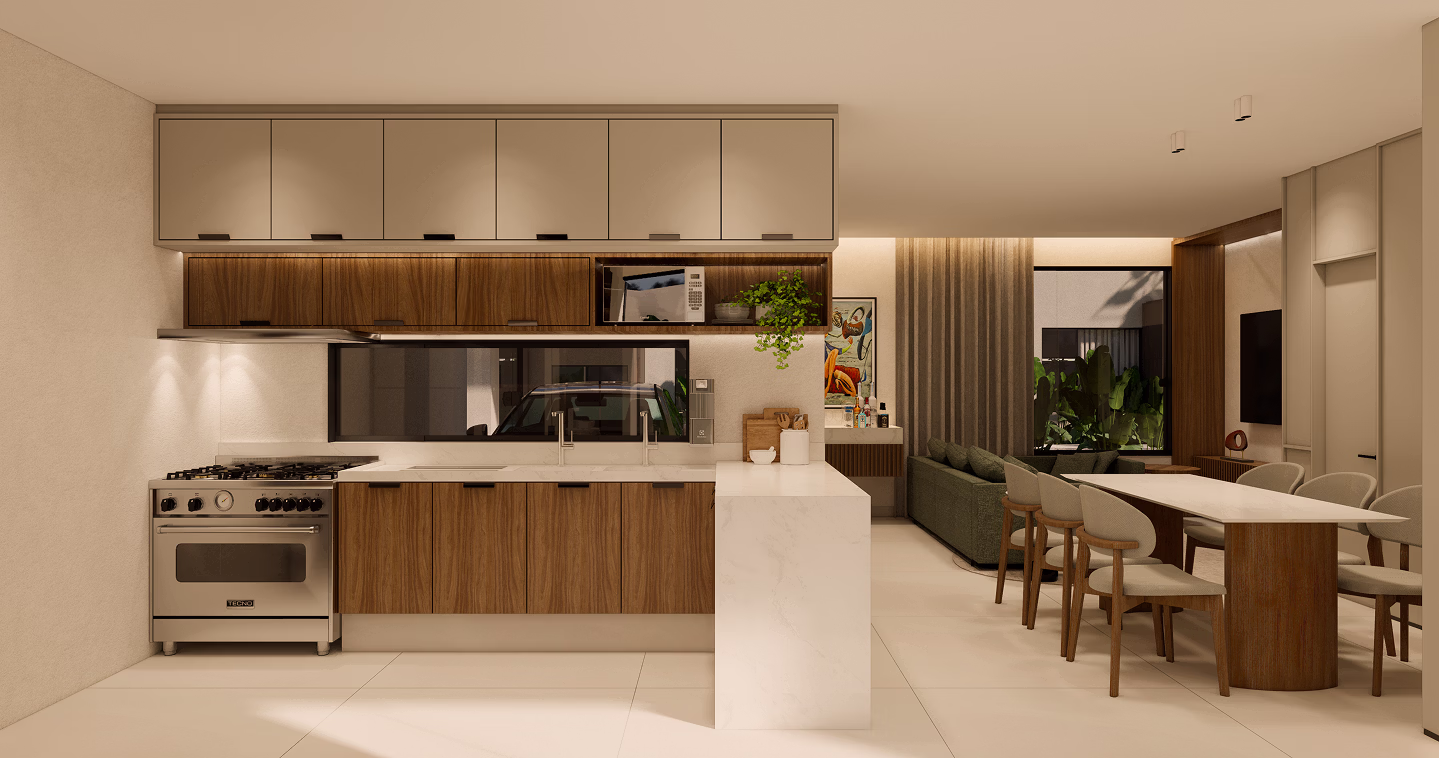 Para todos os espaços internos, o foco é em qualidade de vida para quem vai morar, com espaços amplos, conectados, e que garantem conforto.