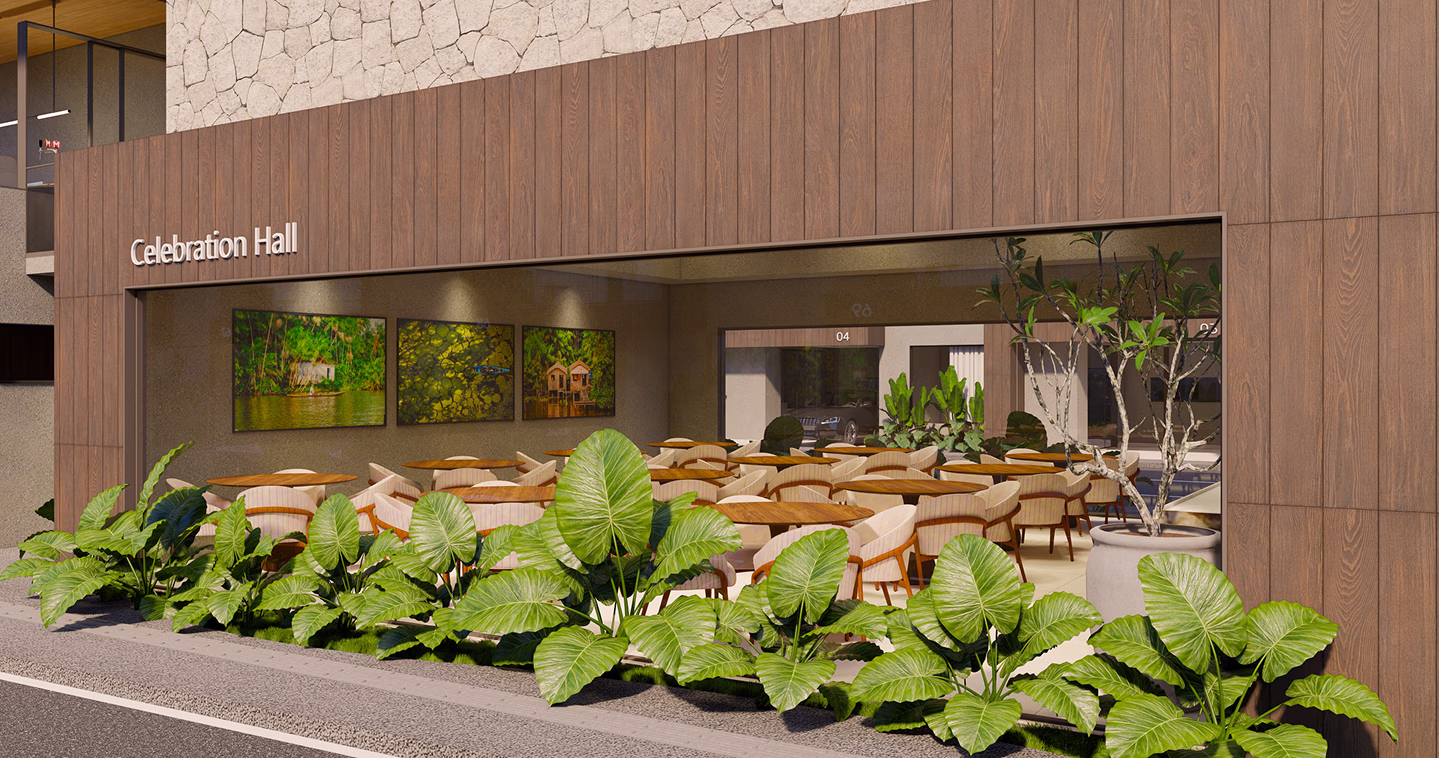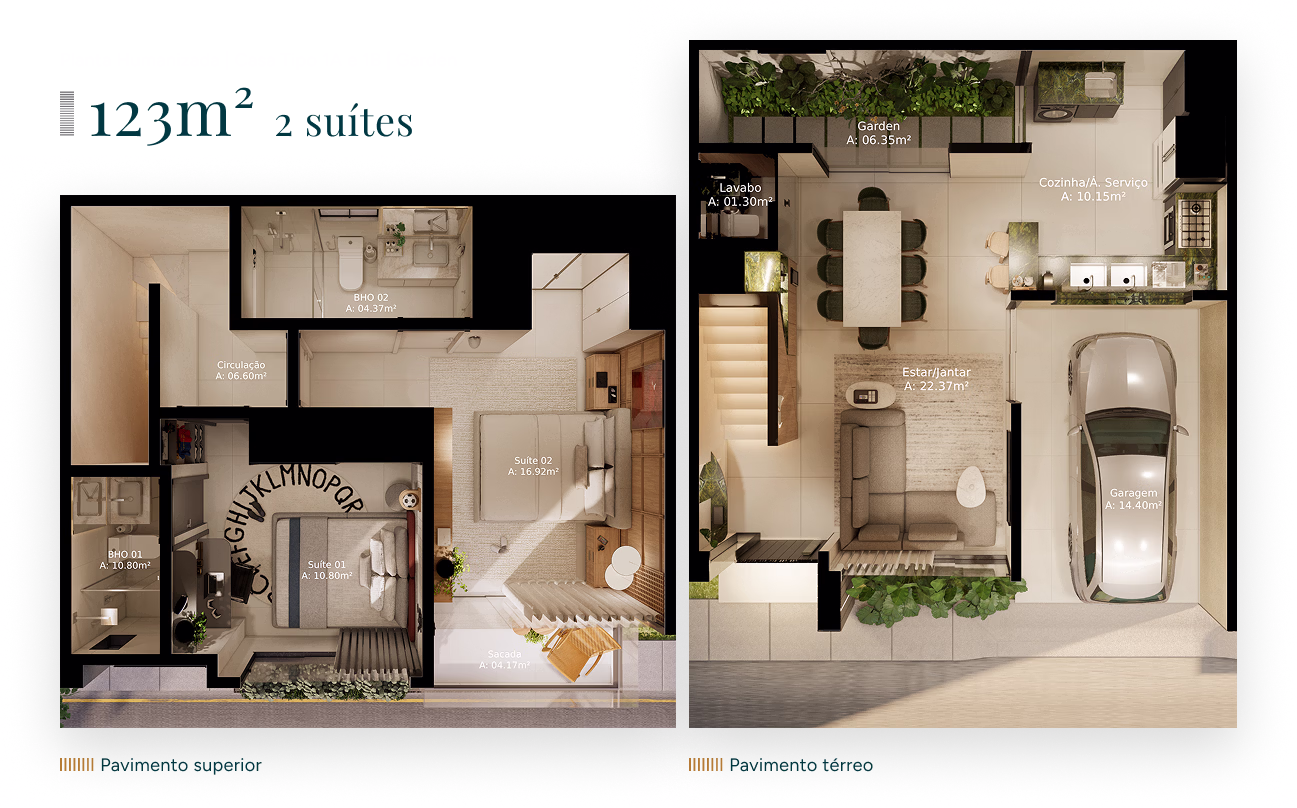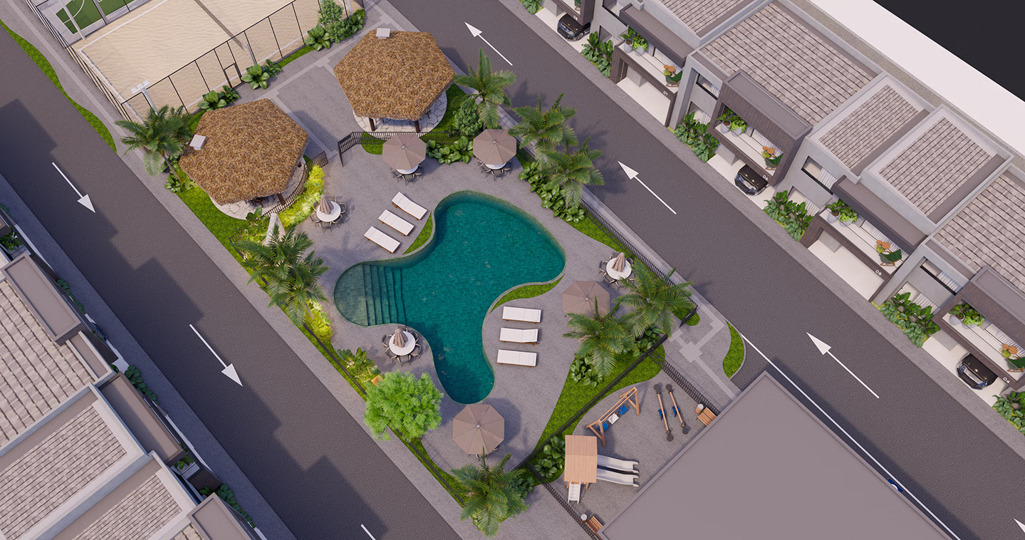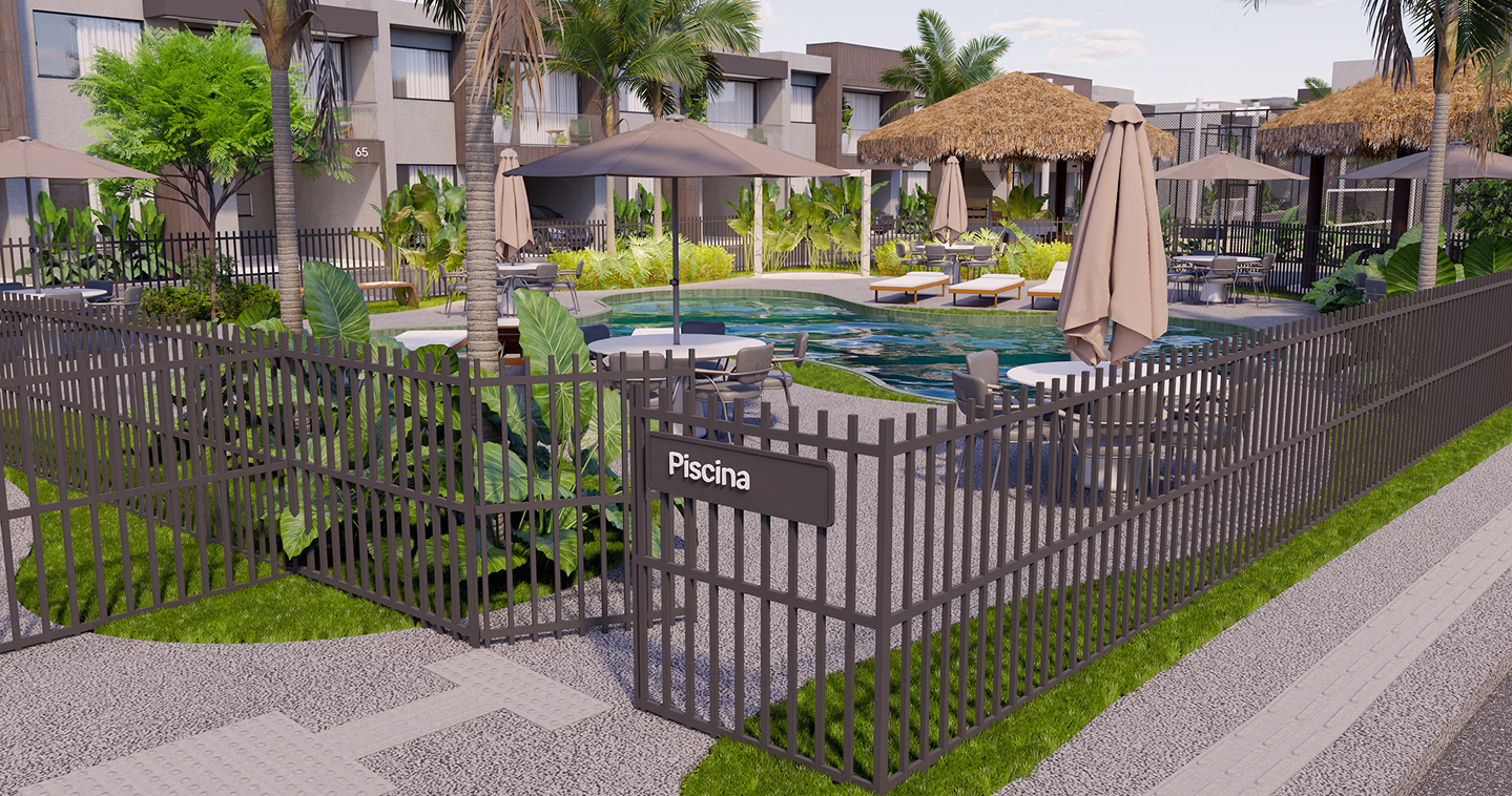 Para os ambientes de lazer, um layout que se complementa com o paisagismo, trazendo linhas sinuosas que oferecem um maior contato com a natureza e privacidade.